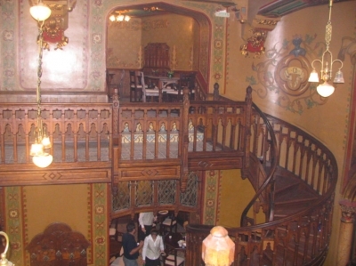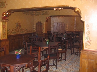 La intrare te intampina o usa rotativa imensa, de lemn, care face trecerea catre o alta lume…cand am terminat de invartit usa parca ajunsesem intr-o alta lume! Restaurantul face parte din categoria restaurant-muzeu, toate elementele decorative sunt din secolul al XIX-lea: lambriuri, picturi, candelabre, sculpturi din lemn pana la scaune.