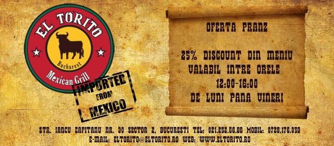 Vizitati-i in fiecare zi de luni pana vineri, intre orele 12 si 16, si beneficiati automat de o reducere de 25% la consumatia dumneavoastra! Sunteti asteptati pe taramul mexican de pe Iancu Capitanu!