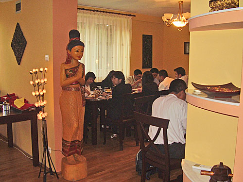 Siam, noul restaurant Thai. Parcare ok, cu deschis de portiera de catre responsabilul cu securitatea, intrarea usor alambicata. Inauntru stupoare: aproape plin! Imi zic: ori astia au multi prieteni ori sunt foarte buni si s-a dus vestea rapid, ca reclama nu le-am vazut-o mai pe nicaieri.